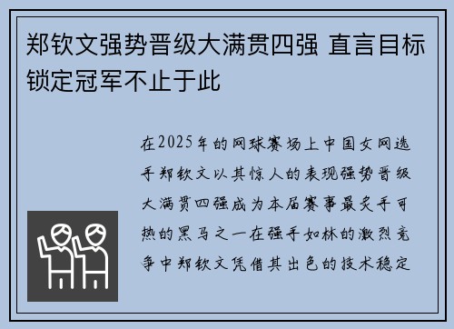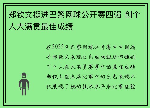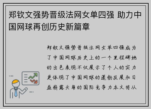 郑钦文强势晋级法网女单四强,成为了中国网...