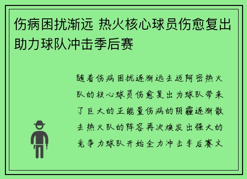 随着伤病困扰逐渐远去,迈阿密热火队的核心...