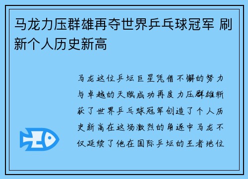马龙,这位乒坛巨星,凭借不懈的努力与卓越...