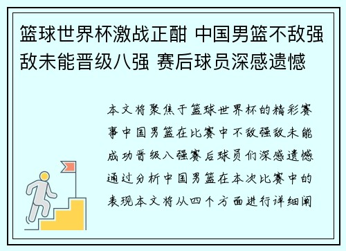本文将聚焦于篮球世界杯的精彩赛事,中国男...