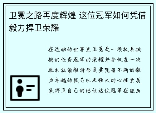 在运动的世界里,卫冕是一项极具挑战的任务...
