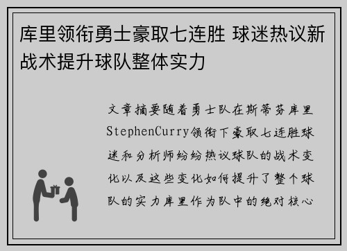 文章摘要:随着勇士队在斯蒂芬·库里(St...