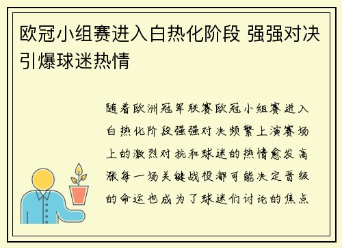 随着欧洲冠军联赛(欧冠)小组赛进入白热化...