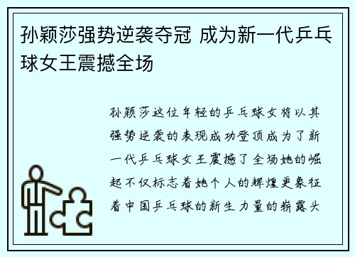 孙颖莎,这位年轻的乒乓球女将,以其强势逆...
