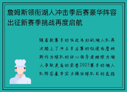 随着新赛季的临近,洛杉矶湖人队再次踏上了...