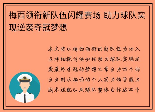 本文将以梅西领衔的新队伍为切入点,详细探...