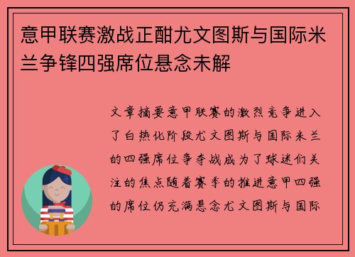 文章摘要:意甲联赛的激烈竞争进入了白热化...