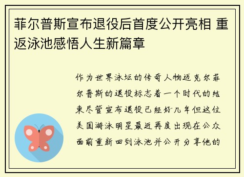 作为世界泳坛的传奇人物,迈克尔·菲尔普斯...