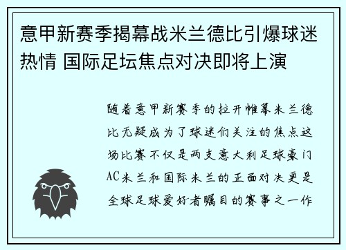 随着意甲新赛季的拉开帷幕,米兰德比无疑成...