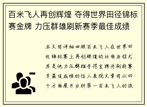 本文将详细回顾“百米飞人”在世界田径锦标...