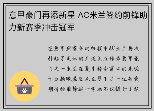在意甲新赛季的征程中,AC米兰再次引起了...
