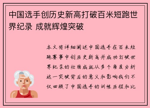 本文将详细阐述中国选手在百米短跑赛事中创...