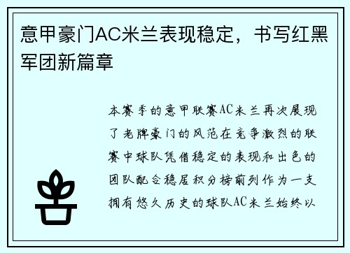 本赛季的意甲联赛,AC米兰再次展现了老牌...
