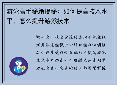 游泳是一项全身性的运动,不仅能锻炼身体,...