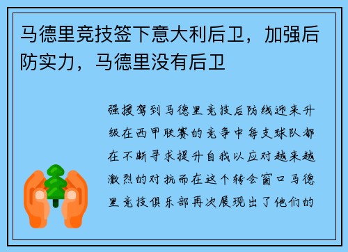 强援驾到,马德里竞技后防线迎来升级 在西...